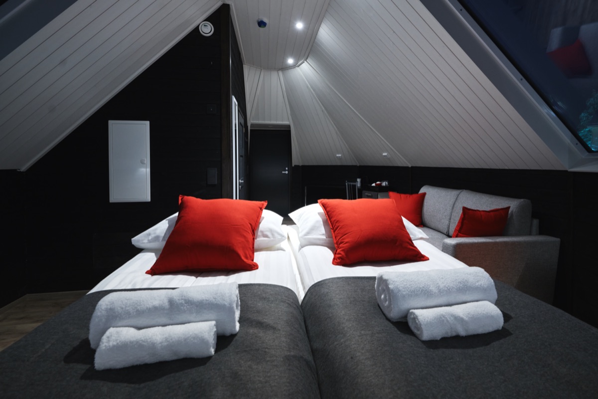 Aurora Ferienhaus mit Glasdach für 2-4 Personen mit ca. 24 m². Und in den Varianten Doppelbett Queen Size oder 2 Einzelbetten und einem Schlafsofa, Badezimmer mit Dusche/ WC, Minibar und Gratis WLAN.