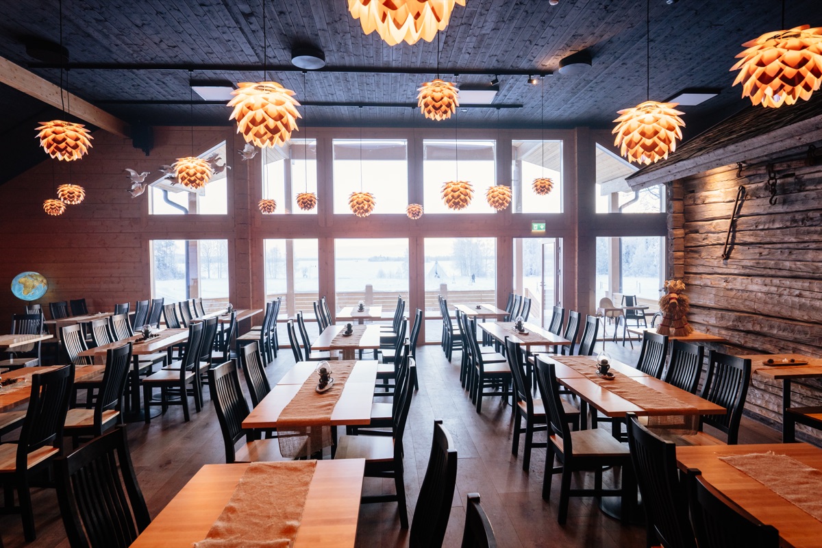 Einrichtungen: Rezeption, Apukka Cafe, Apukka Souvenirshop. Das Apukka Restaurant bietet lokale nordische Küche mit einem gewissen modernen Touch. Im Herzen des Restaurants steht ein riesiger Steinofen, auf welchem Brot und Brötchen direkt frisch gebacken werden und die große Fensterfront bietet einen tollen Blick auf den (gefrorenen) See. Das Abendessen wird in Buffetform serviert.