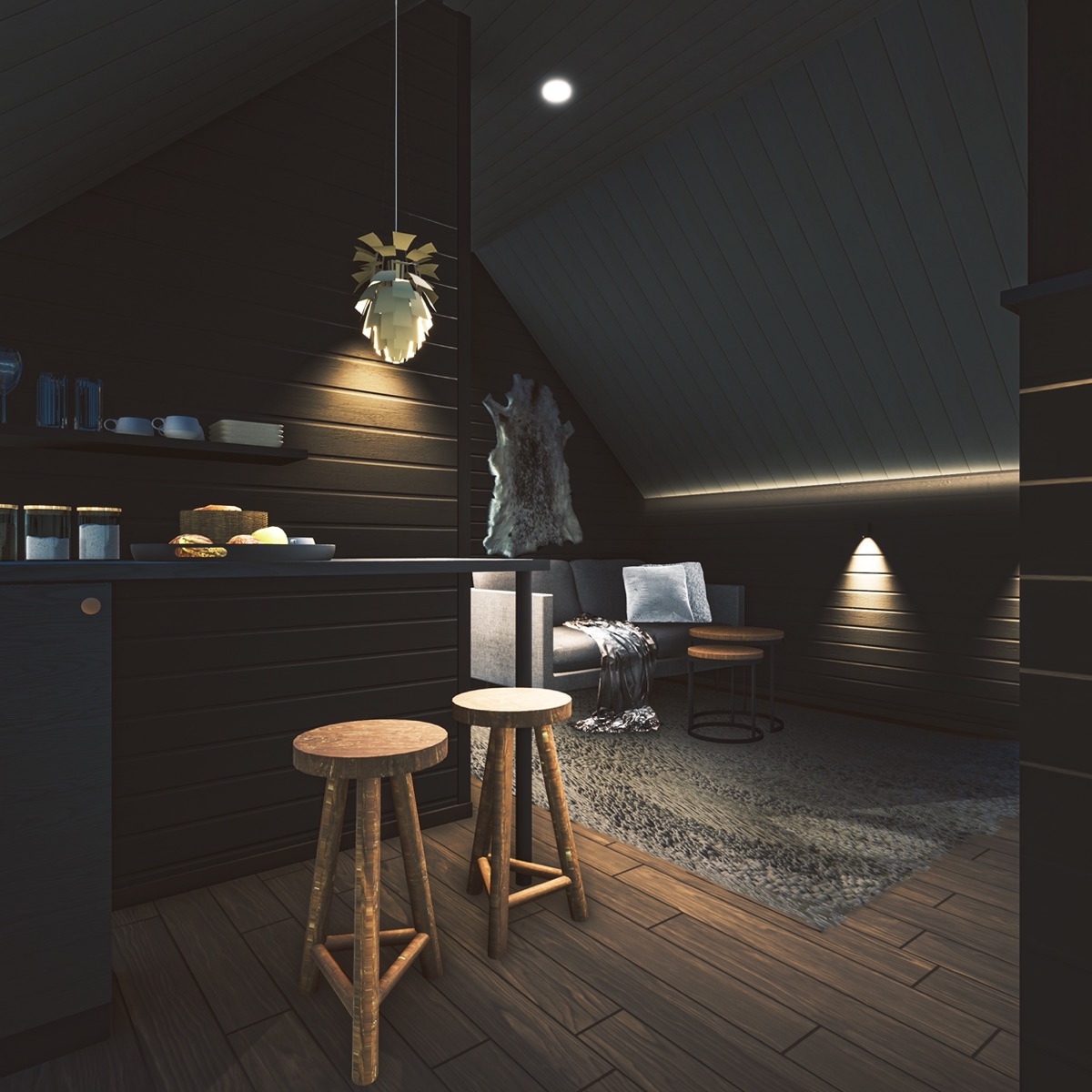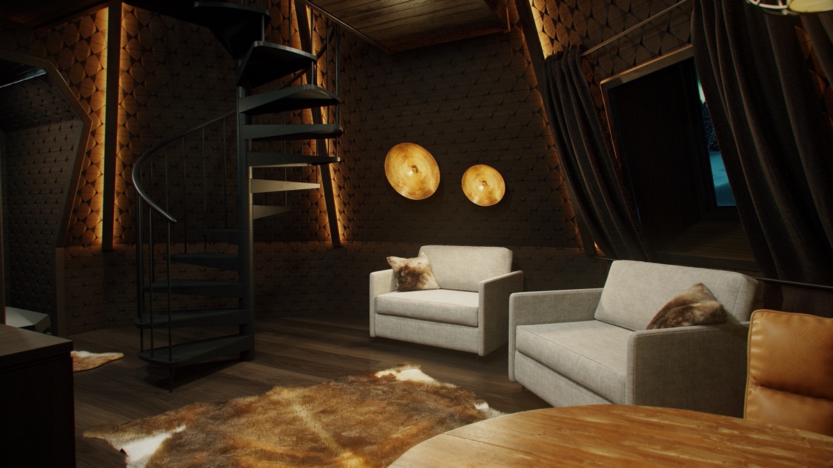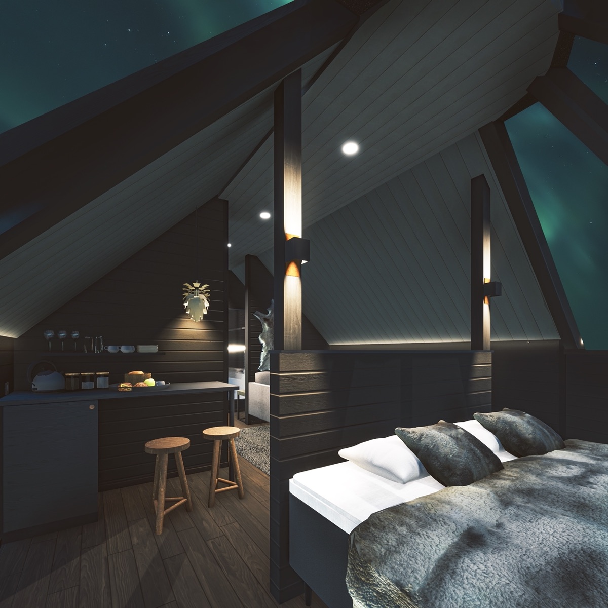 Nordlicht Suiten im Kotadesign in 2 Größen, für bis zu 4 Personen mit ca. 31-33 m² - diese Art der Unterkunft ist etwas ganz besonderes. Die kleine gemütliche Hütte besteht aus 2 Etagen, in der oberen Etage befindet sich nur das Doppelbett direkt unter einem Dach aus Glas. Im unteren Bereich bieten große Fenster eine wunderbare Aussicht. Ausgestattet ist die Hütte mit einer Sitzecke, diese kann in zwei zusätzliche Betten umgewandelt werden, Kamin sowie kleinem Badezimmer mit Dusche und WC.