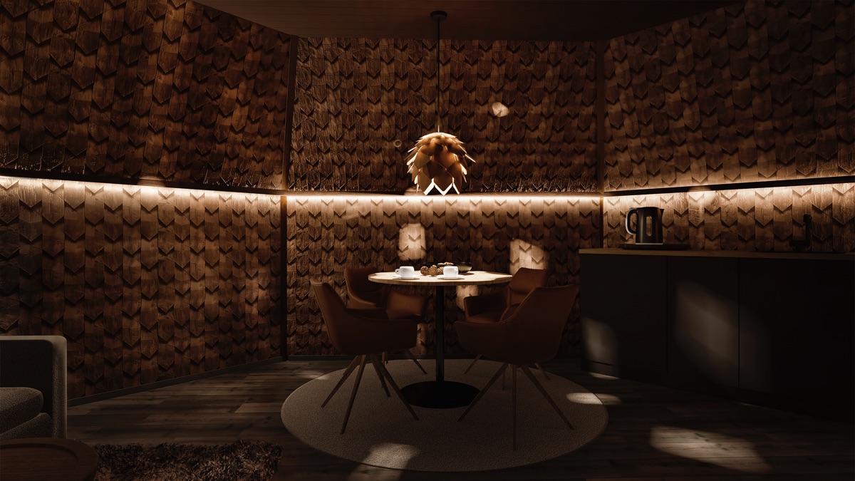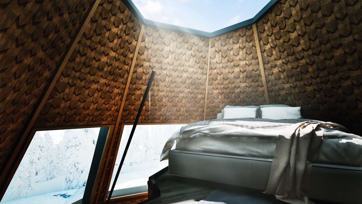Die Glasdachhütte mit zwei Schlafbereichen (41 m²) verfügt zusätzlich über einen gemütlichen Wohnbereich mit Sofa und Elektrokamin sowie einen Essbereich mit Esstisch und Stühlen. Im Hauptschlafzimmer befindet sich ein King-Size-Bett, in einer kleinen Nische ein Queen-Size-Bett, und im Wohnbereich steht ein kleines Schlafsofa zur Verfügung.