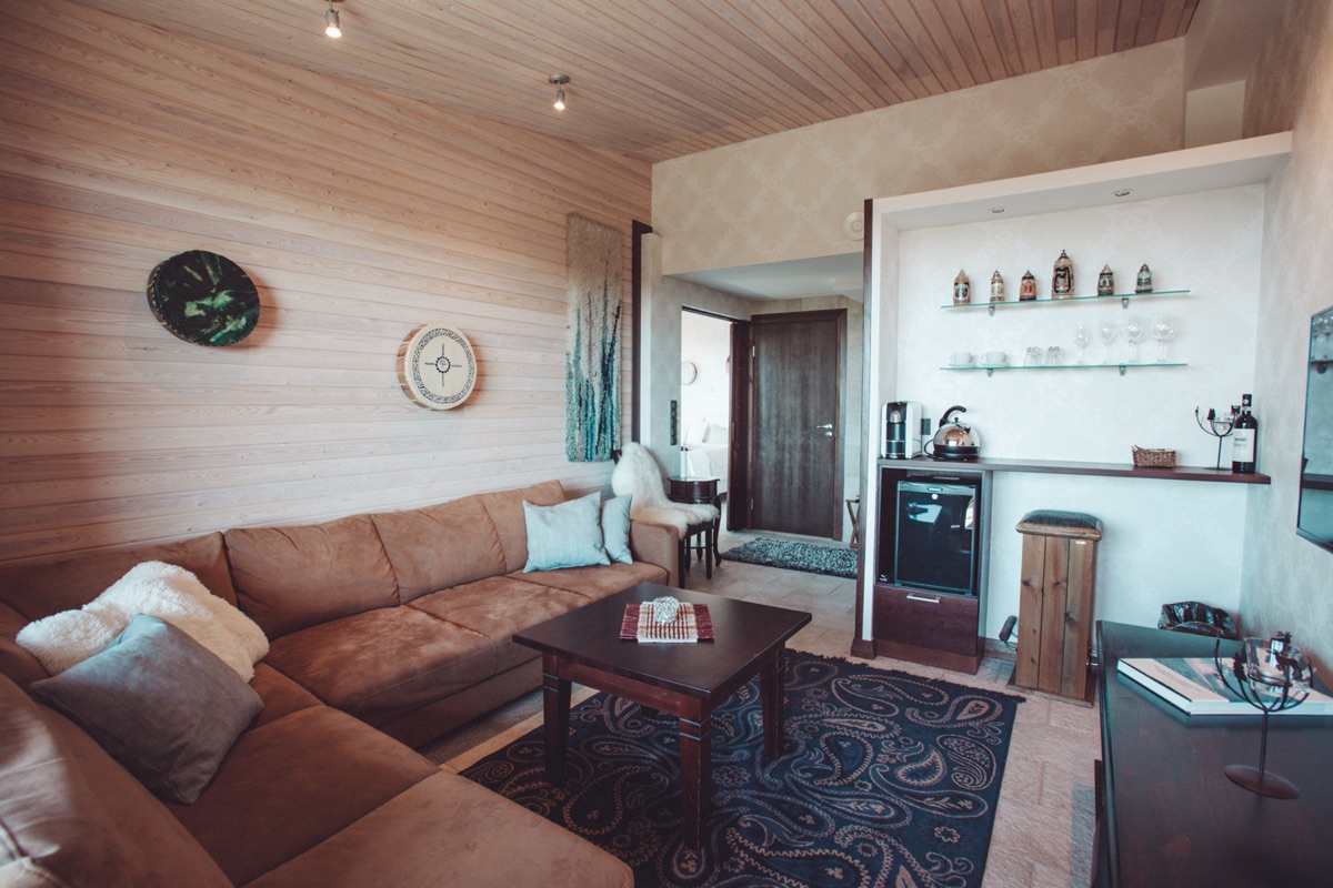 Die größere Mastersuite Ahma bietet neben einem Schlafzimmer einen separaten Wohnraum. Verbringen Sie hier oder in der privaten Sauna entspannte Stunden nach einem erlebnisreichen Tag! Ein drittes Bett für ein Kind ist bei Bedarf auch hier möglich.