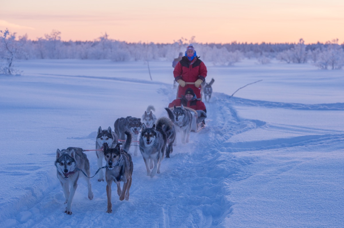 Sie besuchen die Huskyfarm von Anna und Pasi, die zu jedem ihrer Hunde eine Geschichte zu erzählen wissen. Nach einer Einweisung in das Führen eines Hundeschlittens geht es los. Bei der ca. 12 km langen Hundeschlittenfahrt teilen sich jeweils 2 Personen einen Schlitten und wechseln sich mit dem Lenken ab. Die Landschaft ist vielfältig: weite, offene Flächen, zugefrorene Seen und verschlungene Wege durch den Wald machen die Fahrt abwechslungsreich. Während einer Pause genießen Sie warme Getränke und einen kleinen Snack und die Fahrer können wenn gewünscht tauschen.