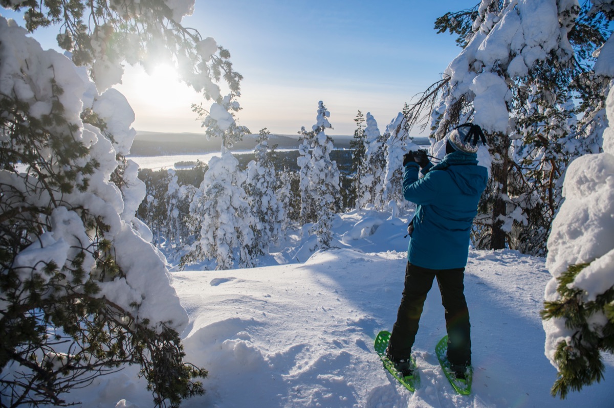 Nach dem heutigen Frühstück machen Sie sich zu Fuß auf den Weg zum ca. 2 km entfernten Fjäll Lappland Natur, Kultur und Besucherzentrum. Wer möchte kann einen Tretschlitten nutzen, ein beliebtes Fortbewegungsmittel der Finnen im Winter. Am Besucherzentrum treffen Sie Ihren Guide und starten Ihre Schneeschuhwanderung. Sie erwandern den Berg Jyppyrä, ein für die Samen heiliger und ganz besonders spiritueller Ort. An einem Aussichtspunkt machen Sie eine Pause und genießen die Szenerie und ein heißes Getränk. Nach der Tour haben Sie die Gelegenheit das Naturzentrum sowie das Örtchen Hetta, mit seiner wunderschönen Wildniskirche, Geschäften und Silberschmieden, zu besuchen. Zurück zum Hotel geht es zu Fuß (ca. 2 km).