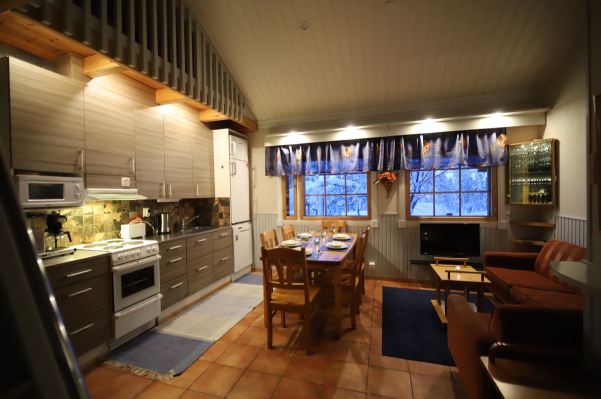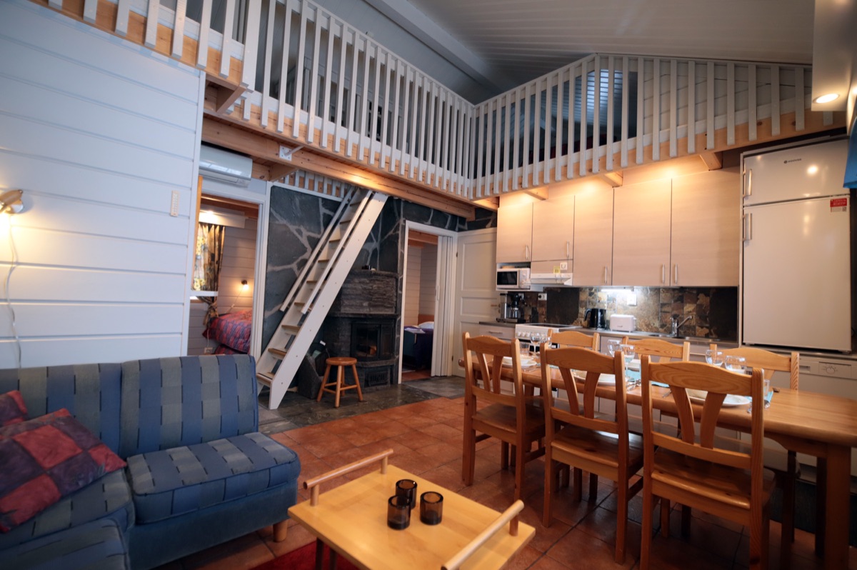 Das Ferienhaus "Fjäll-Birke" beherbergt 2 Wohneinheiten, jede hat eine Größe von 47 m² im Erdgeschoss sowie weiteren 22 m² im Obergeschoss. Es ist komfortabel eingerichtet und verfügt über einen kombinierten Wohn-/Küchenbereich mit Kamin, 2 separate Schlafzimmer mit jeweils 2 Einzelbetten sowie ein Badezimmer mit Dusche/WC und Sauna. Der offene Galeriebereich ist über eine Treppe erreichbar. Hier befinden sich 2 weitere Betten und 2 Sofabetten. Es gibt Schlafmöglichkeiten für insgesamt 8 Personen. 2 Tretschlitten und ein Plastikschlitten stehen für das Doppelhaus, also 2 Wohnungen gemeinsam zur Verfügung.