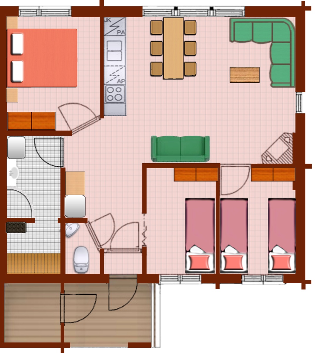 Das Ferienhaus "Bergwind" beherbergt ebenfalls 2 Wohneinheiten, jede mit einer Größe von 61 m² auf einer Ebene und ist komfortabel und gemütlich eingerichtet. Jede Haushälfte verfügt über einen kombinierten Wohn/ Küchenbereich mit Kamin, 3 separate Schlafzimmer: 2 davon mit jeweils 2 Einzelbetten, 1 Schlafzimmer mit Etagenbett. Ein zusätzliches Schlafsofa im Wohnzimmer bietet weitere 2 Schlafmöglichkeiten - insgesamt stehen 8 Schlafplätze zur Verfügung. Im Badezimmer befinden sich Sauna und Dusche, das WC ist separat.