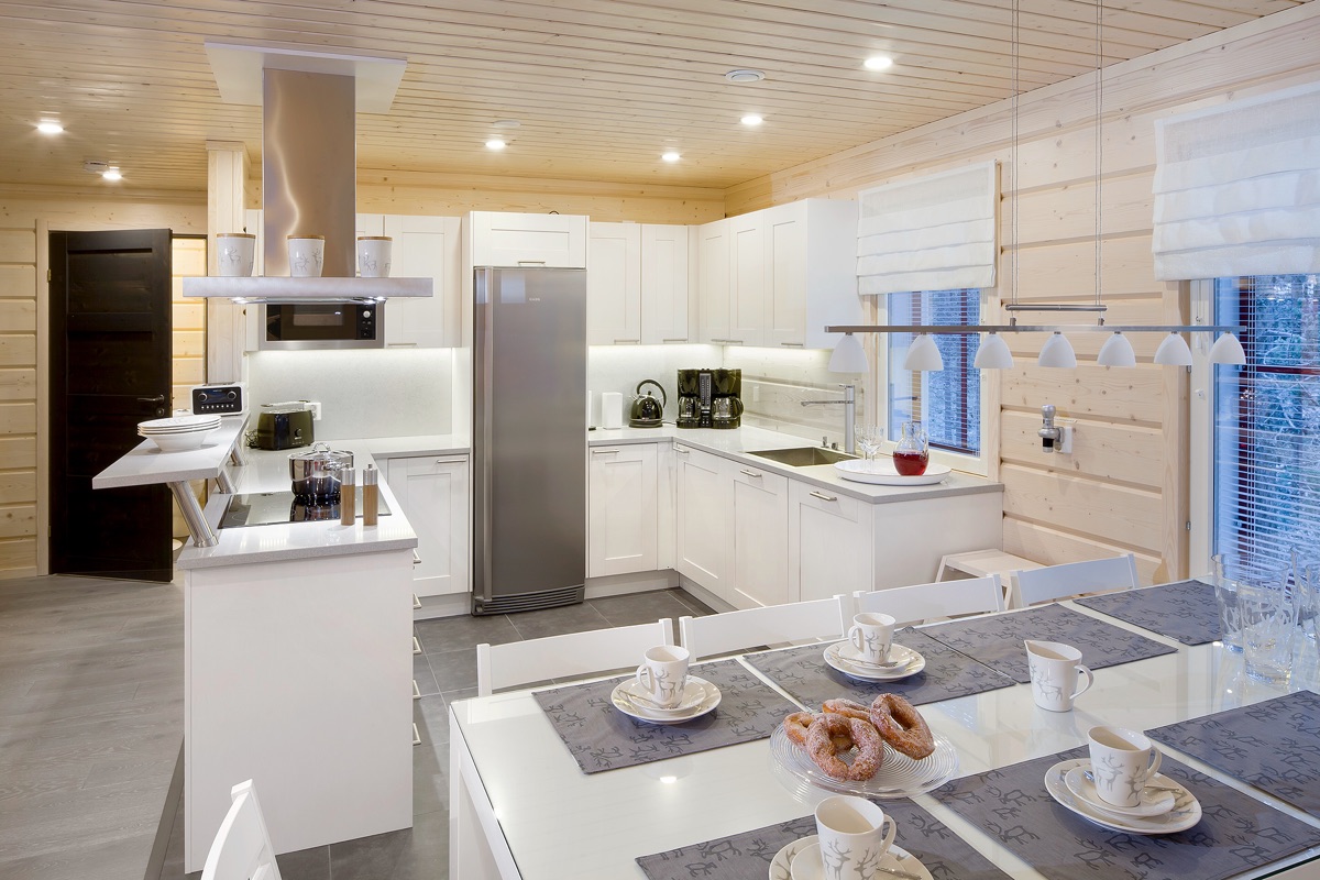 Das White Dream B mit 136 m² in der anderen Hälfte des Doppelhauses ist für eine große Gruppe gut geeignet. Es kann bis zu 12 Personen beherbergen und ist mit 4 Schlafzimmern und einer offenen Schlafgalerie mit 4 weiteren Schlafmöglichkeiten, 3 Toiletten und 2 TV-Geräten (ggf. nur finnische Programme) gut ausgestattet. Die Sauna hat Platz für bis zu 10 Personen.