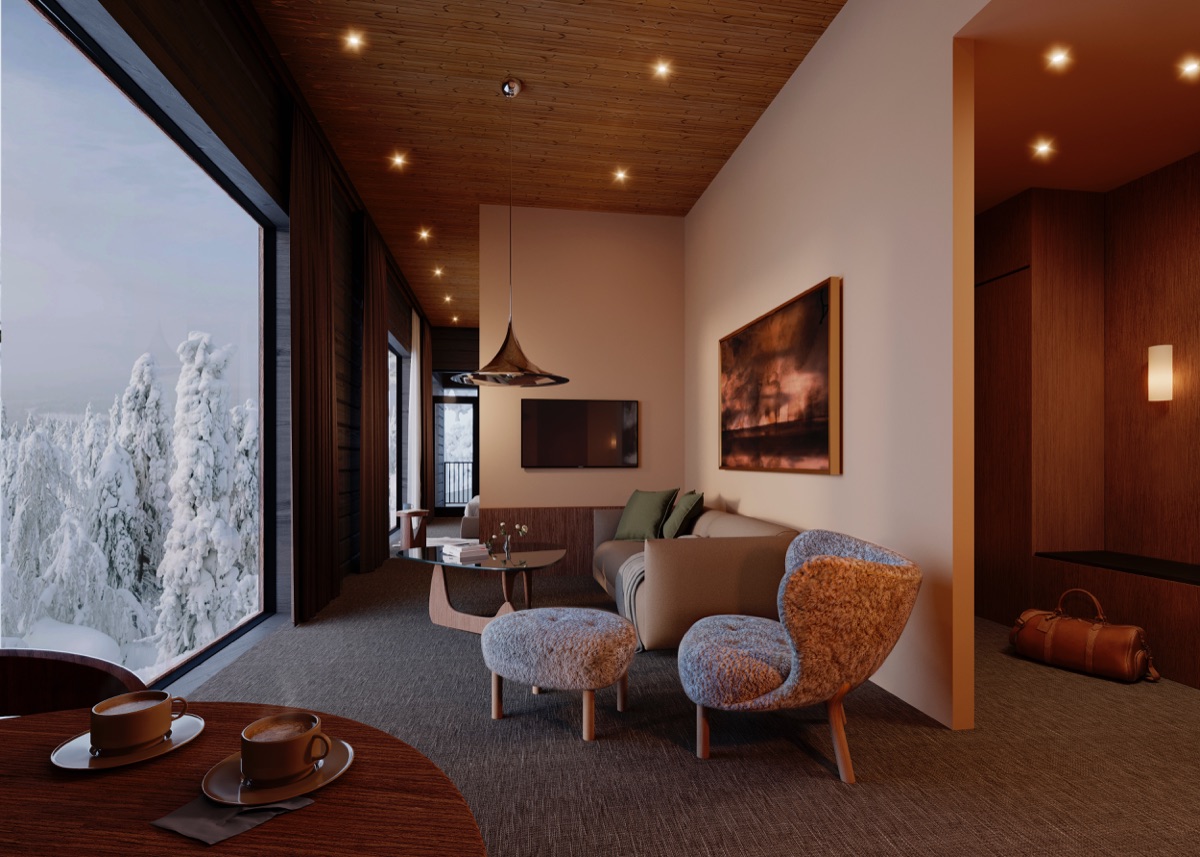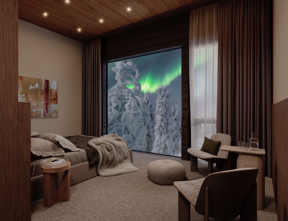 So wohnen Sie: Die Premium Doppelzimmer (25 m²) verbinden stilvolles skandinavisches Design mit dem beruhigenden Charakter der arktischen Natur. Große bodentiefe Fenster lassen viel Licht herein und eröffnen einen eindrucksvollen Blick auf die verschneiten Wälder oder den endlosen Himmel. Hochwertige Materialien, warme Farbtöne und klare Linien schaffen eine Atmosphäre voller Ruhe und Komfort. Alle Zimmer sind mit komfortablen Twin- oder Doppelbetten, einem eleganten Badezimmer sowie hochwertigen Möbeln ausgestattet. Ob als gemütlicher Rückzugsort im Erdgeschoss oder in den höher gelegenen Zimmern mit spektakulärem Ausblick über die Baumwipfel - jedes Zimmer ist ein Ort zum Wohlfühlen und Ankommen.