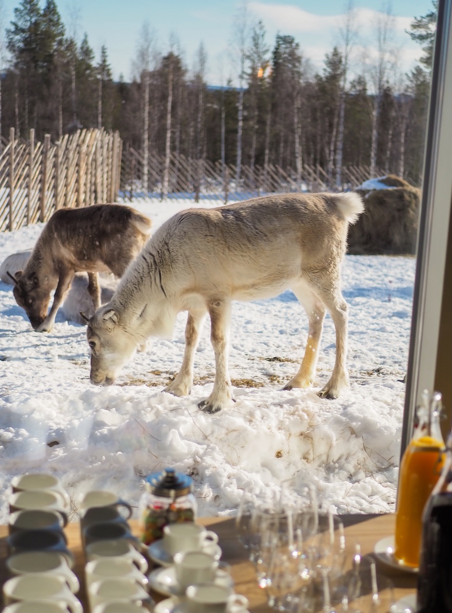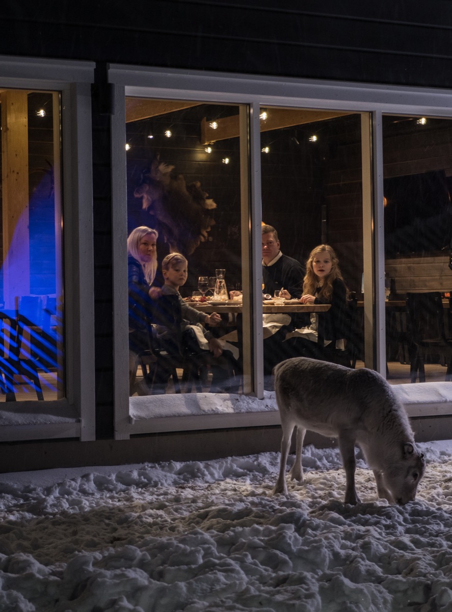 Einrichtungen: Kombinierter Bar - und Restaurantbereich. Das Restaurant bietet Platz für 100 Gäste und vermittelt durch den Kamin und das lappische Design eine heimelige und gemütliche Atmosphäre. Die Küche kreiert nordische Spezialitäten. Das besondere Highlight des Restaurants ist das direkt angeschlossene Rentiergehege, in welchem die Rentiere direkt vor der Fensterfront beobachtet sowie sogar gefüttert werden können.