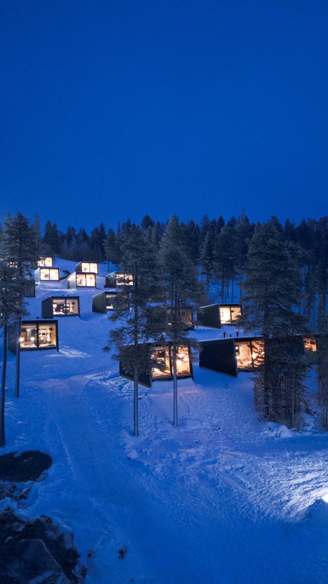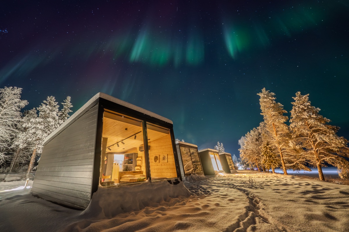 Zusätzlich gibt es Panorama-Hütten, die nah am Hotel und doch ruhig in einem kleinen Wald liegen. Auf 30 m² bieten sie ein Doppelbett, eine gemütliche Sofaecke (mit Platz für 1-2 weitere Personen), einen Tisch mit angrenzender Kitchenette (Kühlschrank, Mikrowelle, Kaffeemaschine, Wasserkocher, Geschirr) sowie ein Bad mit Dusche/WC. Bodentiefe Fenster öffnen den Blick auf funkelnde Sterne, tanzende Nordlichter und den verschneiten Wald.