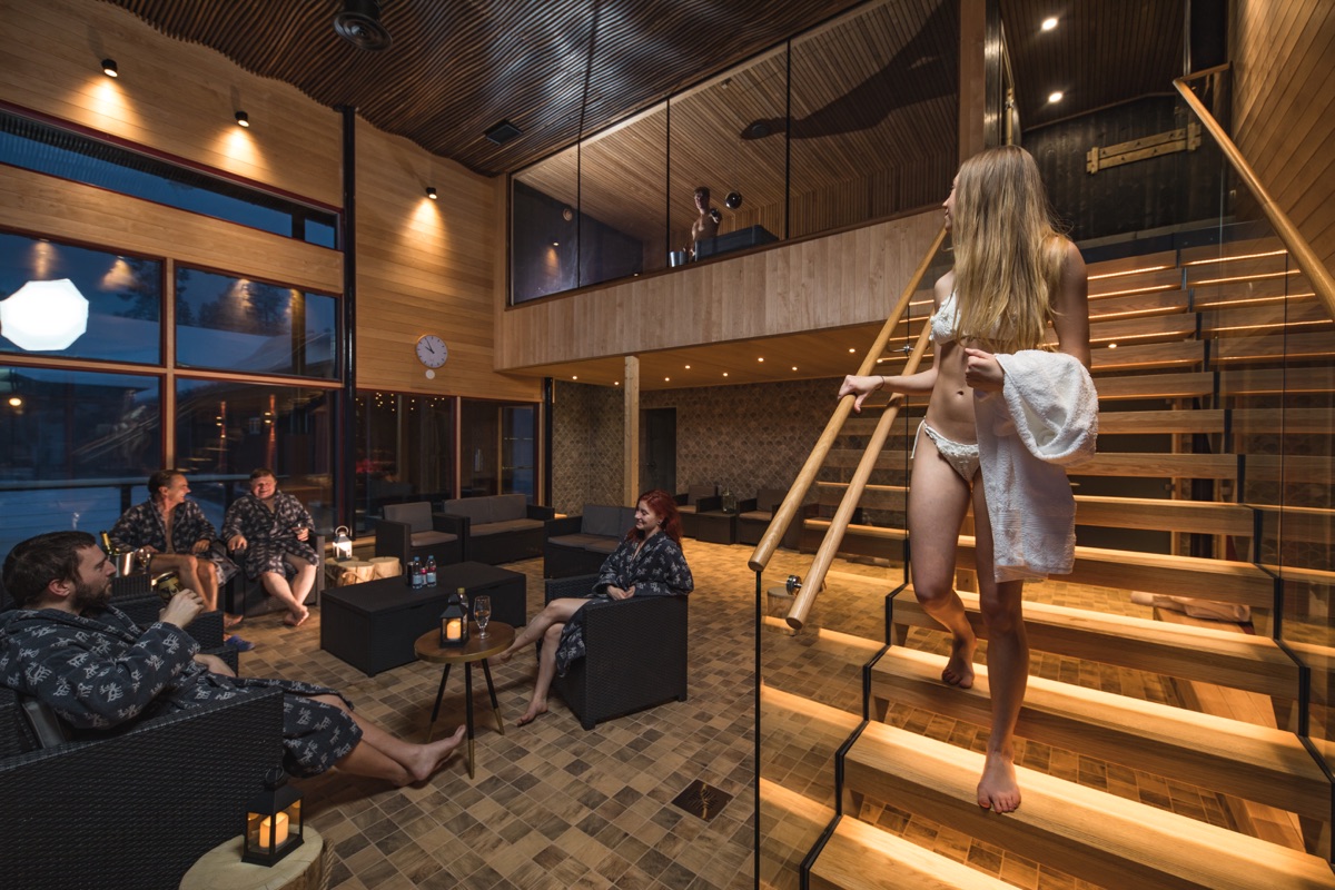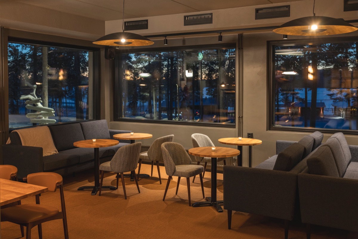 Einrichtungen: Hauptgebäude mit Rezeption und Hotelrestaurant mit lappländischer regionaler Küche, Bar mit Kamin, ein Pub im Untergeschoss. Arktische Saunawelt. Im Saunagebäude gibt es 5 verschiedene Saunen, Wellnessanwendungen und Eislochbaden im See. Der Saunabereich ist gegen Gebühr. W-LAN im Hauptgebäude.
