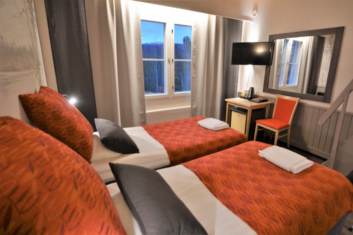So wohnen Sie: Das Hotel Ylläsrinne bietet insgesamt 50 Zimmer, alle sind im skandinavischem Flair eingerichtet. In jedem Zimmer wurde eine Wand individuell von der finnischen Designerin Riitta Ahonen handbemalt. Die Zimmer sind ca. 18 m² groß, verfügen über getrennte Betten mit je 90 cm Breite. Alle Zimmer sind Nichtraucherzimmer und mit Dusche/WC, Haartrockner, TV und einem kleinen Kühlschrank ausgestattet. Ein Wasserkocher sowie Kaffee und Tee zur Zubereitung gehört ebenfalls zum Service.