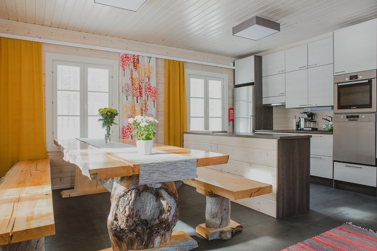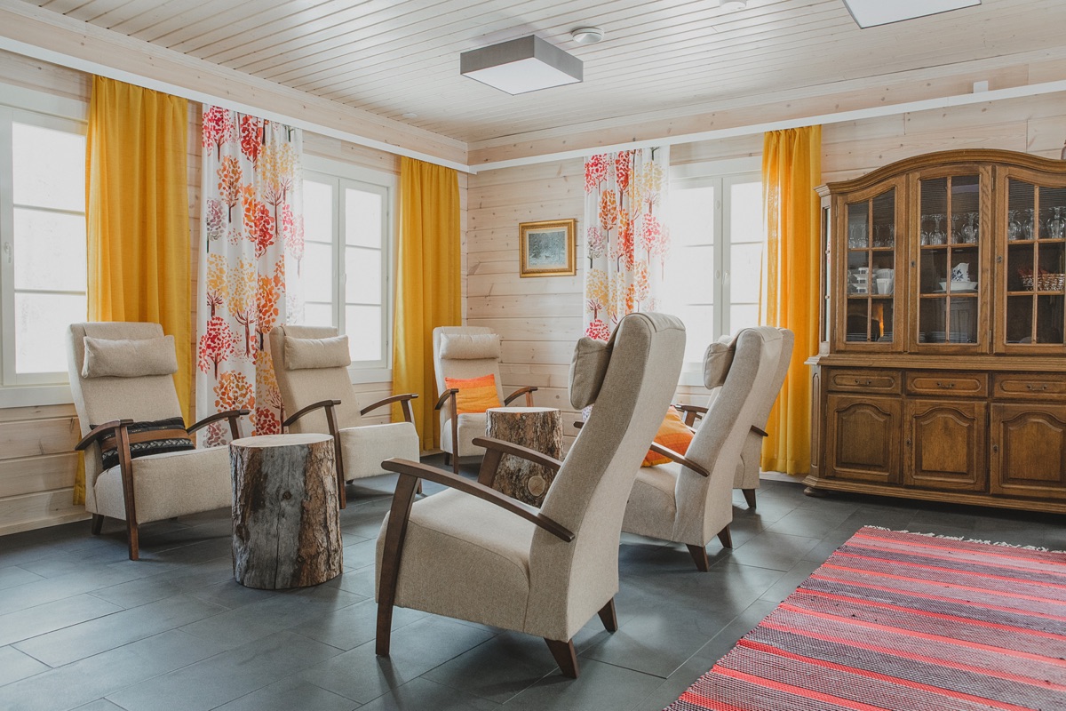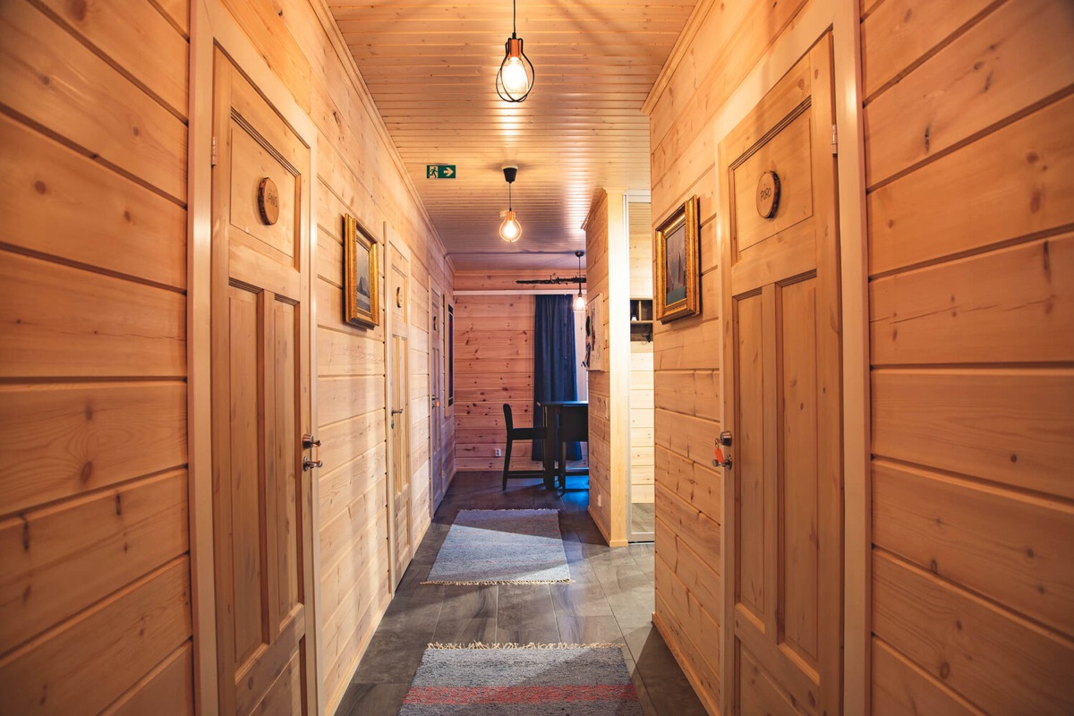 So wohnen Sie: Das kleine Resort bietet Platz für ca. 20 Personen. Es besteht aus einem Haupthaus, in dem sich Rezeption, Restaurant sowie der Yogaraum befinden, einem Holzblockhaus für 10 Personen, 5 Waldsuiten, einer finnischen Grillhütte, einer kleinen Hütte für Besuche vom Weihnachtsmann sowie einem Gehege für Rentiere. Sie können dieses Resort mit Ihrer Familie oder Freunden exklusiv mieten. Das Haus bietet 5 Schlafzimmer mit je 2 Einzelbetten, 2 Badezimmer, eine Gemeinschaftsküche, Wohnzimmer/ Loungebereich und Infrarotsauna. Die Waldsuiten befinden sich alle nebeneinander in einem Gebäudekomplex, sie haben eine Größe von 46 m² und sind ausgestattet mit Küche, Sauna, Schlafzimmer und Wohnzimmer mit Kamin. Eine der Suiten bietet Platz für 4 Personen und einige haben ein Schlafsofa für 1-2 Kinder. Alle Suiten sind individuell eingerichtet und dekoriert.