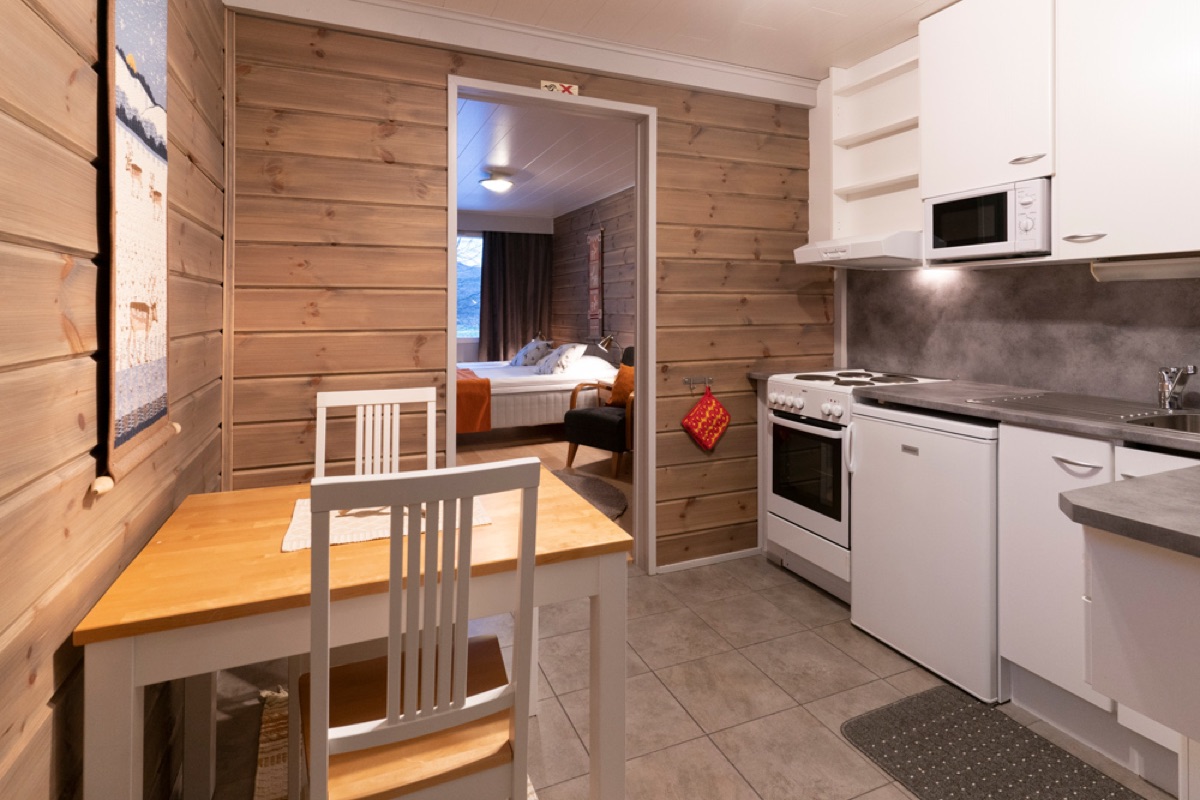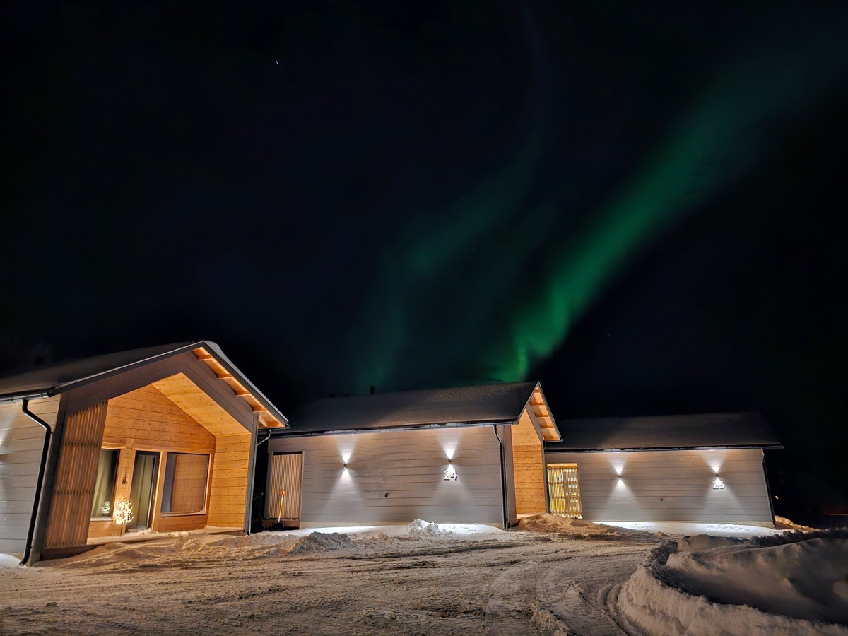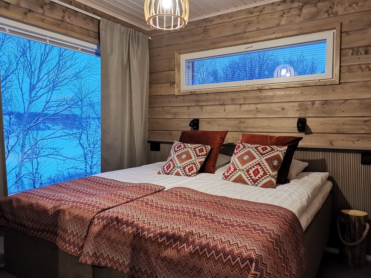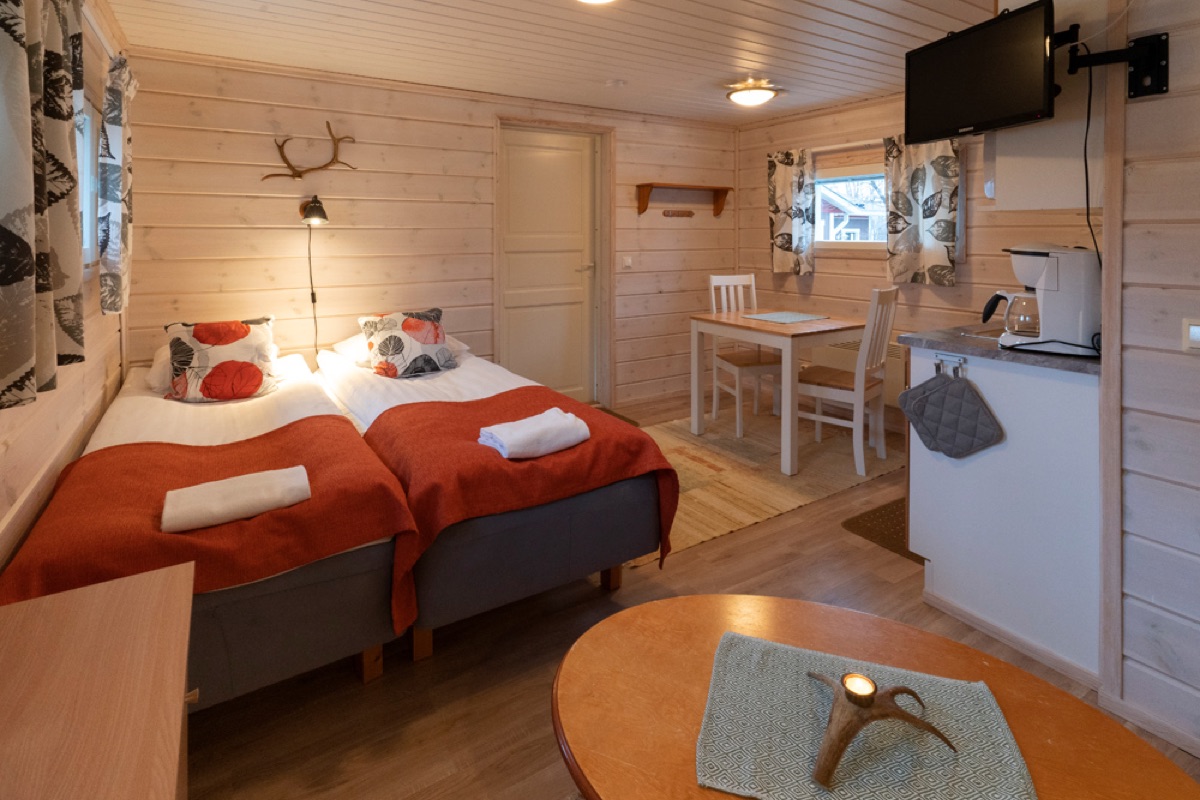 Seit der Wintersaison 2019/20 gibt es vier neue Superior-Ferienhaushälften, die sich direkt am Ufer des Teno-Flusses befinden. 2 Häuser beherbergen insgesamt 4, geschmackvoll und gemütlich eingerichtete, Wohnungen mit einer Größe von jeweils 40 qm. Die große Fensterfront bietet einen guten Blick auf den nächtlichen Himmel und vielleicht sogar auf Nordlichter! Jede Ferienhaushälfte verfügt außerdem über einen eigenen Kamin, eine private Sauna und eine gut ausgestatteten Küchenzeile, die in den Wohnbereich integriert ist und eine Terrasse. Auf einem Schlafsofa im Wohnzimmer ist Platz für 1-2 weitere Personen.