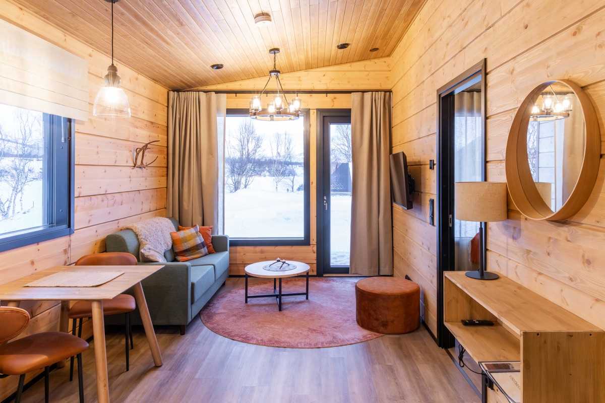 Insgesamt vier Superior-Ferienhaushälften befinden sich in 2 Häusern direkt am Ufer des Teno-Flusses. Die geschmackvoll und gemütlich eingerichteten Ferienhaushälften mit einer Größe von jeweils 40 qm verfügen über eine große Fensterfront mit gutem Blick auf den nächtlichen Himmel und vielleicht sogar auf Nordlichter! Jede Ferienhaushälfte verfügt über einen eigenen Kamin, eine private Sauna und eine voll ausgestatteten Küchenzeile, die in den Wohnbereich integriert ist sowie eine Terrasse. Auf einem Schlafsofa im Wohnzimmer ist Platz für 1-2 weitere Personen.