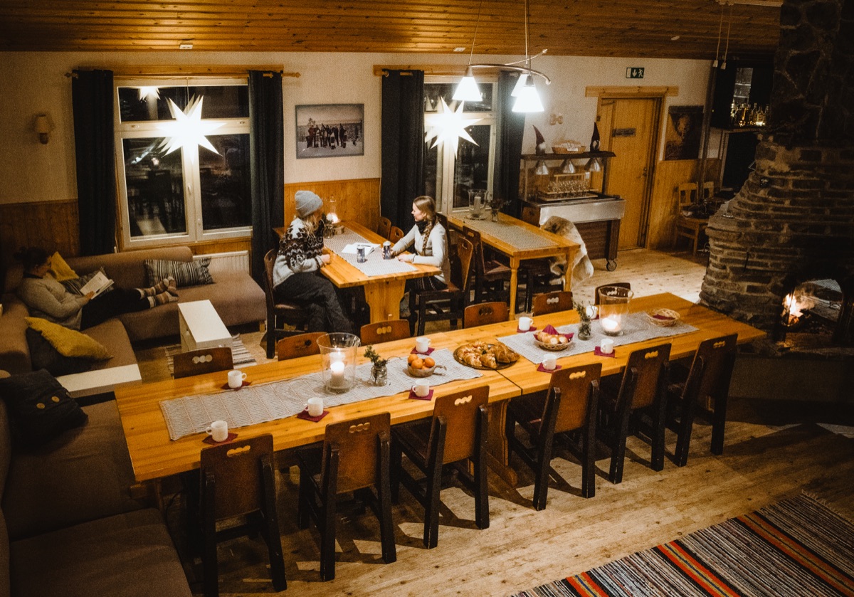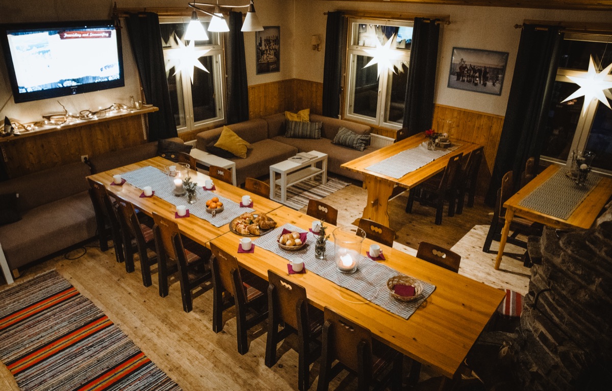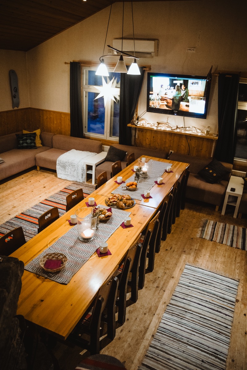 Das Basecamp ist ein Gemeinschaftsbereich, den alle Gäste nutzen. Eine eigene Küche steht nicht zur Verfügung, aber in den Hütten gibt es natürlich Kochmöglichkeiten. Wenn Sie lieber in einem Restaurant essen möchten, finden Sie in Pyhä oder Luosto (beide sind schnell erreichbar) verschiedene Lokale. Eine traditionelle finnische Sauna finden Sie direkt am Seeufer.
