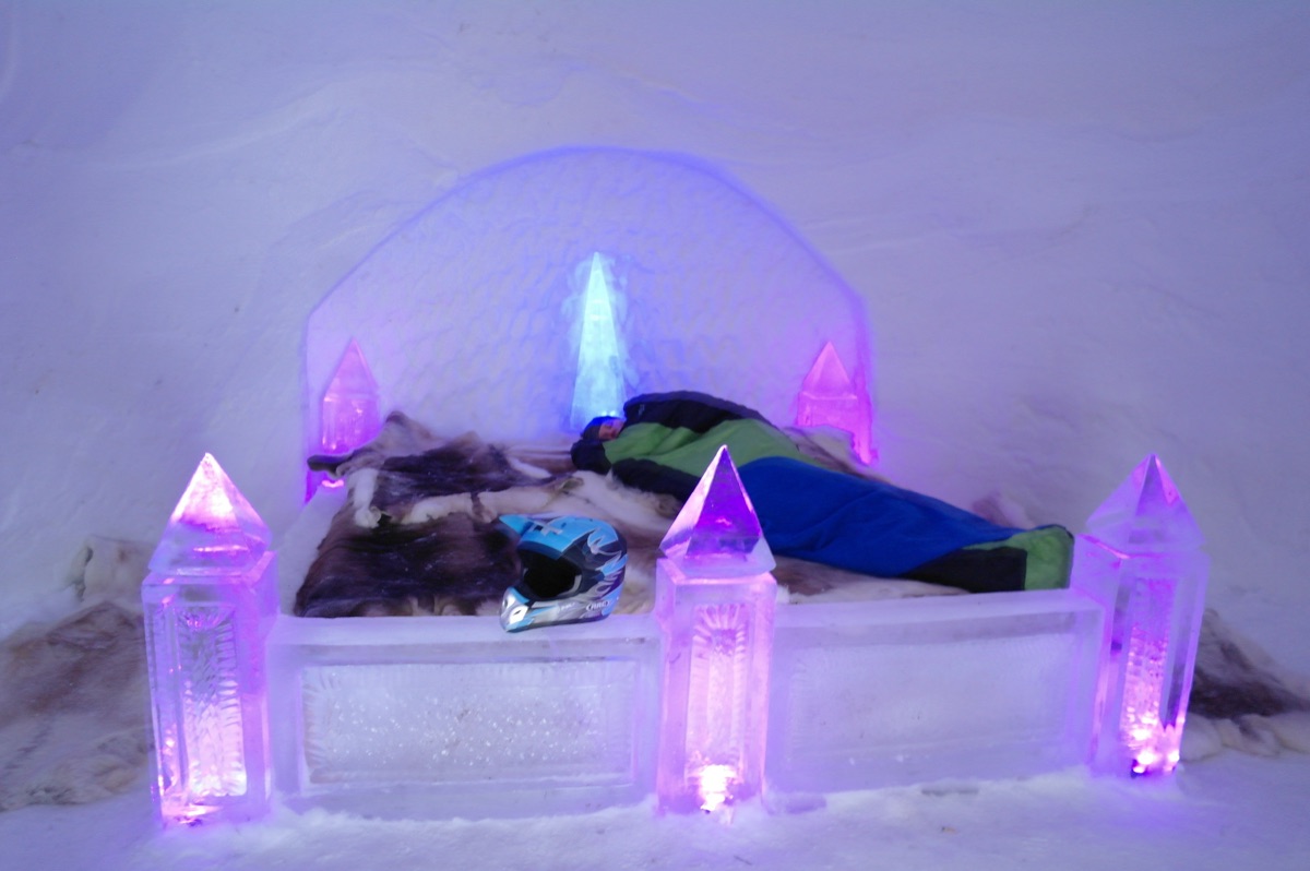 Im, etwa 15 Minuten Fahrtzeit von Levi entfernten, Eishotel haben Sie die Möglichkeit, eine Nacht in einem Zimmer, gebaut aus Schnee und Eis zu verbringen. Im Dezember öffnet es seine Tore und ab Ende April schmilzt das Hotel einfach davon. Aus diesem Grund sieht das Bauwerk auch jedes Jahr etwas anders aus.