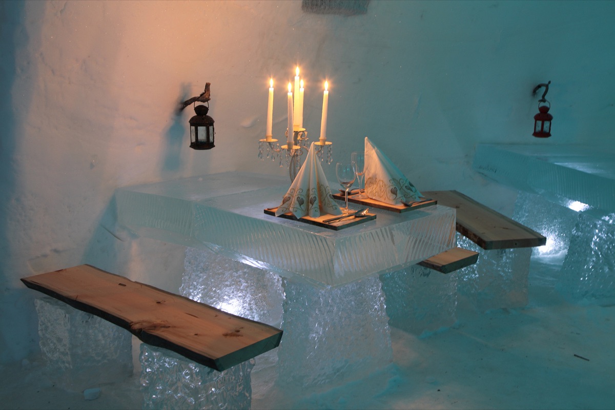 Ausstattung: Zum Hotel gehören das Schneeschloss und die Eisgalerie sowie eine Eisbar. Im Schneeschloss befindet sich eine Eiskapelle, in der regelmäßig Trauungen stattfinden. Im beheizten Restaurant findet das Frühstück am Kaminfeuer statt und Übernachtungsgäste können hier auch am Abend noch etwas essen. Eine Sauna kann am Morgen, nach der Übernachtung im Eis, für innere Wärme sorgen. Das beheizte Hauptgebäude ist die ganze Nacht über geöffnet. Hier stehen Toiletten und Waschräume für die Übernachtungsgäste zur Verfügung sowie ein beheizter Aufenthaltsraum.