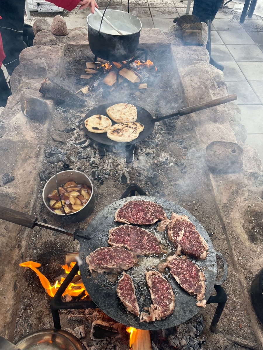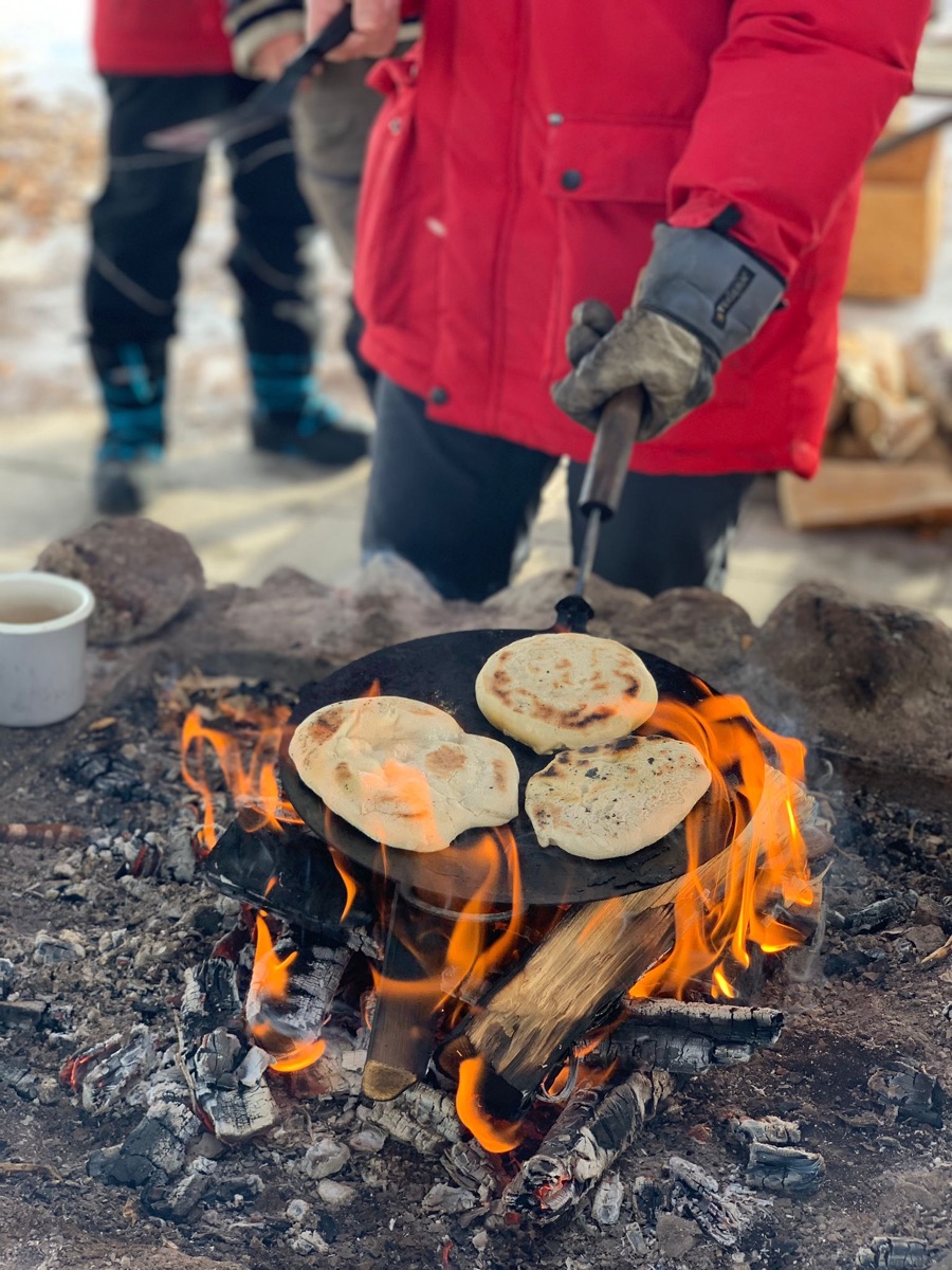 Starten Sie mit einem guten Frühstück in den Tag, bevor Sie direkt von der Huksyfarm zu Ihrer heutigen Schneeschuhwanderung starten. Sie erhalten passende Schneeschuhe und auf Wunsch auch Stöcke sowie natürlich eine Einweisung ins Schneeschuhwandern. Gemeinsam mit Ihrem Wildnisguide starten Sie zu einer etwa 2-stündigen Tour nahe dem Naturschutzgebiet Vittjåkk-Akkanålke. Ihr Ziel für die Mittagspause ist eine einfache Hütte mit Lagerfeuer in der urigen Wildnis. Ihr Guide bereitet für Sie direkt auf dem Feuer ein schmackhaftes 3-Gänge Wildnis Menü aus lokalen Zutaten zu und auch der gute starke schwarze Kaffee zum Abschluss darf nicht fehlen. Nach diesem Gaumenschmaus wandern Sie beschwingt 2 Stunden zurück zur Huskyfarm, wo am Abend bereits das nächste kulinarische Highlight auf Sie wartet, am offenen Feuer gegarter Flammlachs und dazu Gemüse und samisches Fladenbrot namens Gahkku. Den krönenden Abschluss macht die warme Blaubeersuppe zum Dessert.