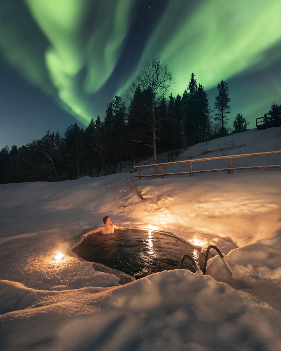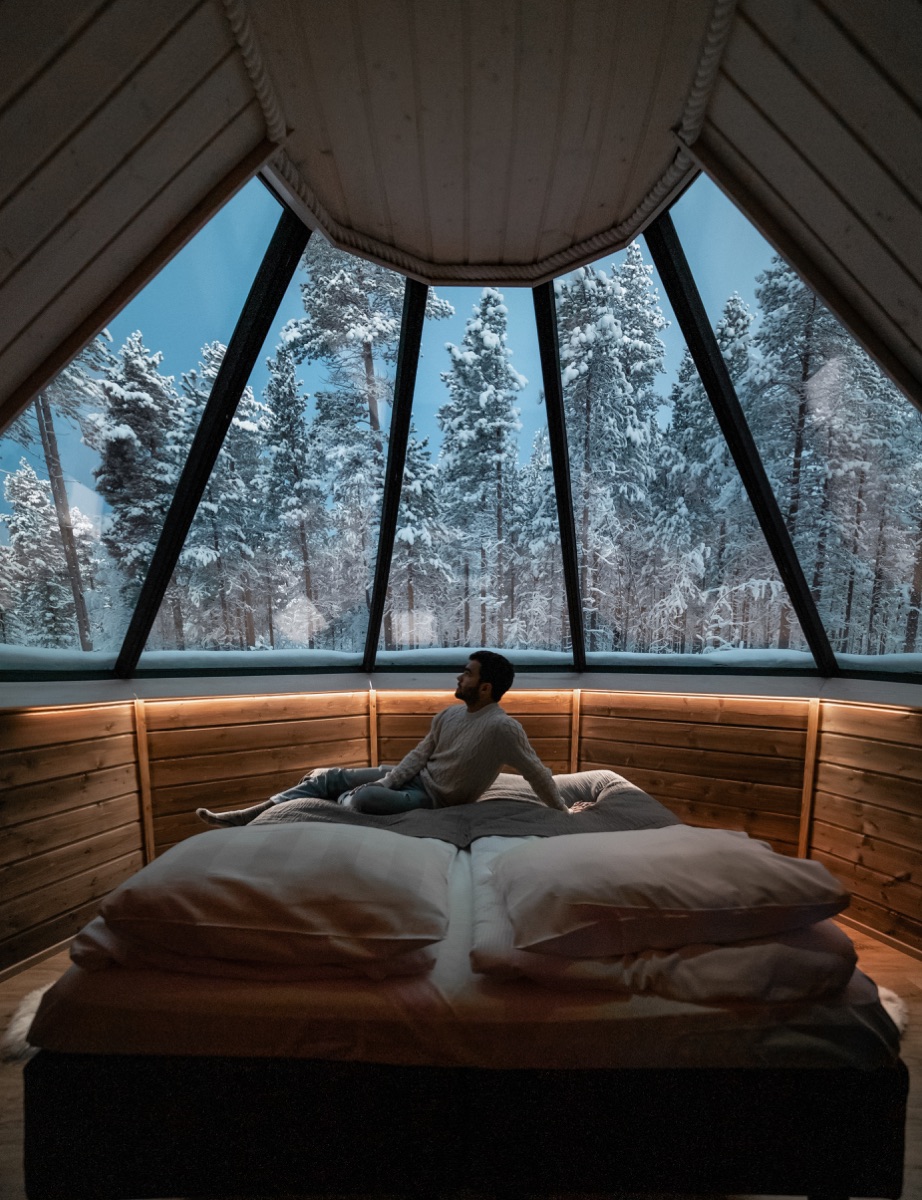 Tagsüber entdecken Sie die winterliche Welt Lapplands bei rasanten Schneemobil-Abenteuern, gleiten mit Husky- oder Rentierteams durch die stille Natur oder testen beim Eis-Karting Ihre Geschicklichkeit. Und wenn die Nacht hereinbricht, beginnt der vielleicht schönste Teil: Von Ihrem Bett aus haben Sie freie Sicht auf den Polarhimmel und perfekte Chancen, die tanzenden Nordlichter zu erleben – ein unvergesslicher Moment zu zweit.
