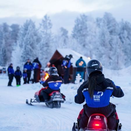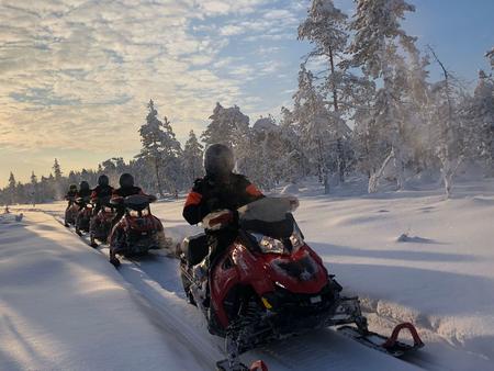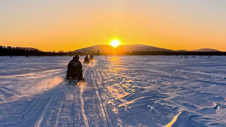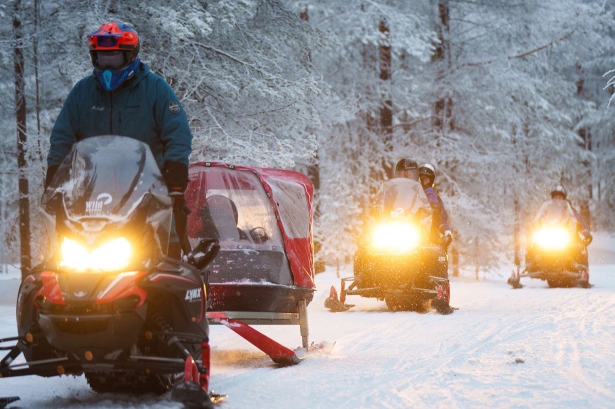 Am Nachtmittag unternehmen Sie eine spannende Motorschlittensafari. In gemächlichem Tempo und angepasst an die Bedürfnisse aller Teilnehmenden, erleben Sie ein sicheres und anfängerfreundliches Abenteuer. Während der Fahrt durch verschneite Wälder rund um den Polarkreis genießen Sie die beeindruckende Winterlandschaft.