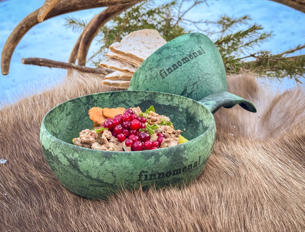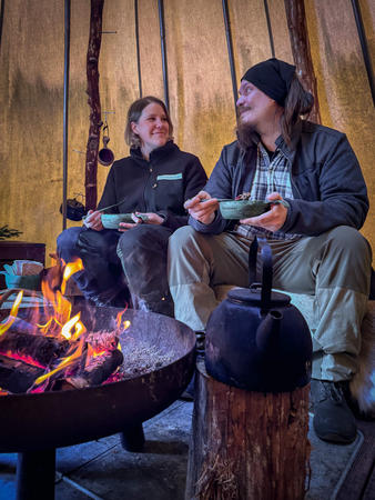 Die Gruppe bei den Rentieren umfasst maximal 12 Personen und ermöglicht so eine besondere, intensive Erfahrung. Anschließend gibt es heißen Saft, Kekse und Erzählungen aus dem Leben mit Rentieren – am wärmenden Feuer in der Kota.