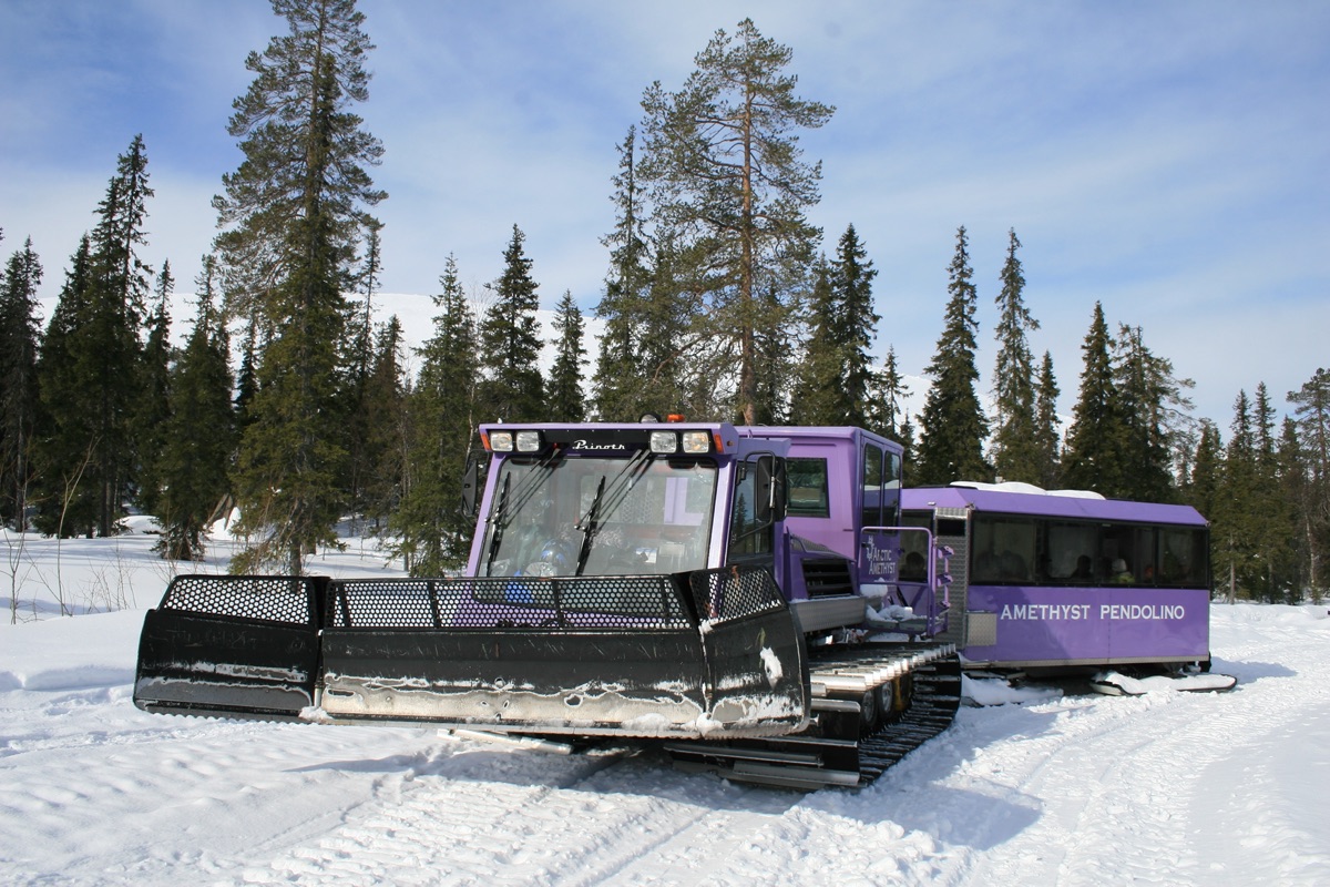 Ein ganz besonderer Transfer bringt Sie zur Amethystmine von Lampivaara. Sie fahren mit einem speziellen Schneezug genannt Pendolino. Es handelt sich um einen beheizten Wagon mit ca. 35 Sitzplätzen gezogen von einem Schneepflug. Dieser bringt Sie bis auf den Gipfel eines Fjälls inmitten des Pyhä-Luosto Nationalparks.