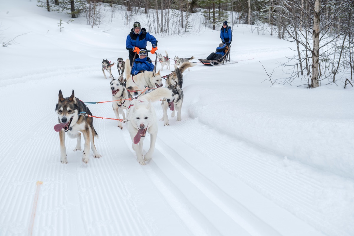 Nach einer Einweisung geht es auf eine etwa 5 km lange Runde mit Ihrem eigenen Hundeteam von 4-6 Huskies. 2 Personen teilen sich i.d.R. einen Schlitten, einer führt den Schlitten, der andere sitzt als Passagier im Schlitten.