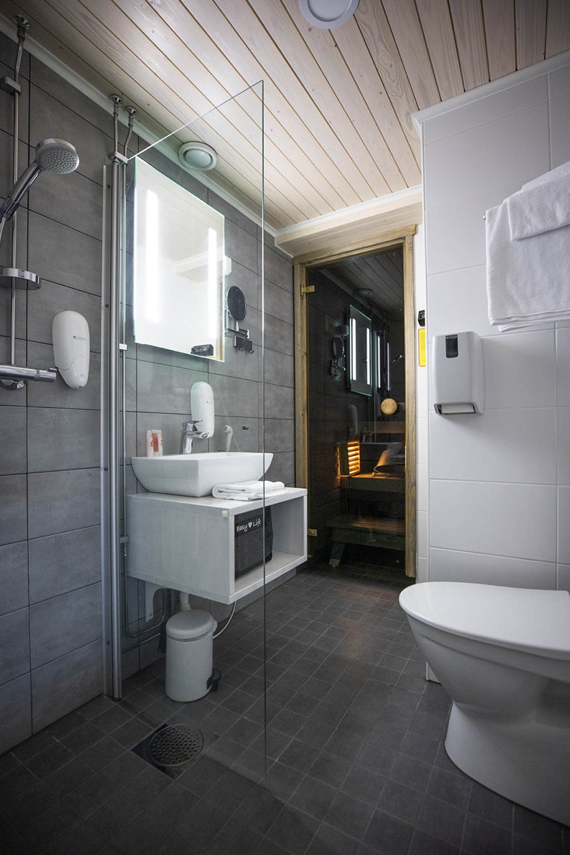 So wohnen Sie: Die 77 Doppelzimmer Superior befinden sich im Hauptgebäude und haben eine Größe von 30 m². Sie sind mit 2 Twin Betten sowie einem Schlafsofa ausgestattet. Die maximale Belegung beträgt 3 Erwachsene oder 2 Erwachsene und 2 Kinder. Die Zimmer verfügen außerdem über Balkon, Badezimmer mit Dusche und Badewanne sowie einer eigenen privaten Sauna. Weitere Ausstattung: Minibar, Wasserkocher, Tee-/ Kaffee-/ Kakao-Zubereitungs-Set, Haartrockner, TV (ggf. keine deutschen Programme), W-LAN, Safe. Das Frühstück wird Ihnen im Restaurant Kaltio serviert, dieses befindet sich in der unteren Etage des Gebäudes.