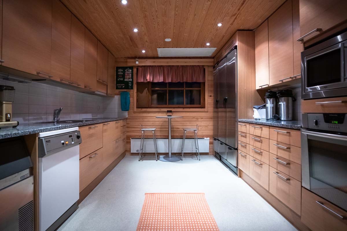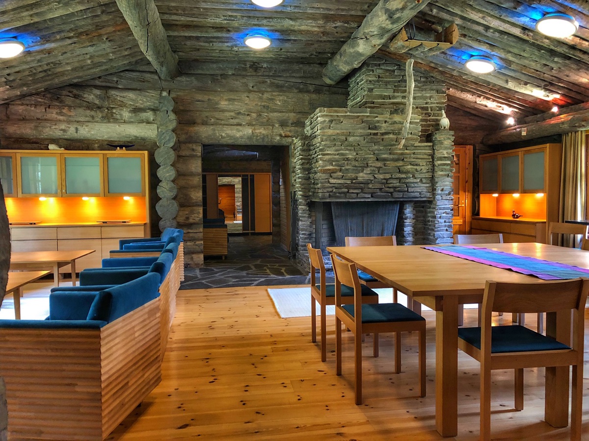 Im südlichen Teil des Gebäudes befindet sich ein großer Wohn- und Essbereich mit Kamin, TV und Videoleinwand, eine voll ausgestattete Küche sowie ein weiteres kleineres Wohnzimmer mit Zugang zur Terrasse und zur finnischen Sauna mit Duschen und Toiletten. Im nördlichen Teil liegen 5 der 11 Schlafzimmer sowie eine elektrisch beheizte Sauna mit angeschlossenem Kaminzimmer und eine kleine Küche mit Kühlschrank, Herd, Geschirrspülmaschine und Mikrowelle.
