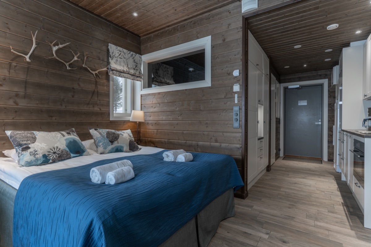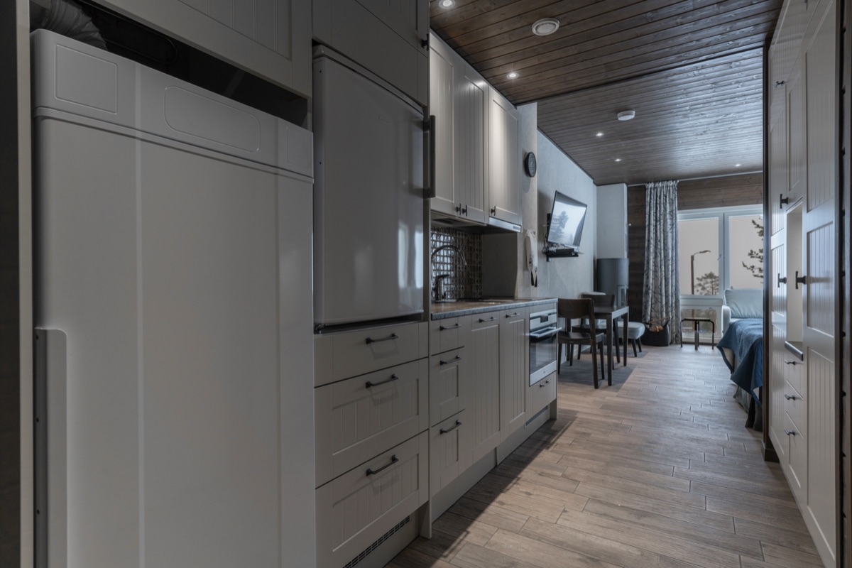 Wer etwas mehr Platz bevorzugt, wählt die, gleich gegenüber vom Hotel gelegenen, Pyhä Suites. fintouring reserviert Ihnen gerne die 43 m² Variante mit 2 separaten Schlafzimmern. Eines davon ist mit dem Etagenbett perfekt für Kinder geeignet. Der Wohnbereich mit Küchenecke bietet Platz für ein gemütliches Beisammensein. Jedes der Appartements verfügt über einen eigenen Balkon. So können Sie bei auftretenden Polarlichtern besonders schnell nach draußen schauen.