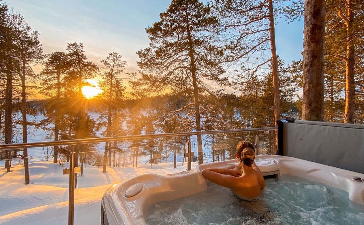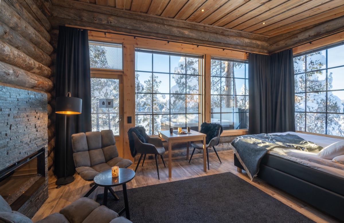 Die Panorama Blockhütten für 2 Personen mit großem Doppelbett verfügen über Kamin, kleine Küchenecke, Panoramafenster mit Blick auf den Inari See, Badezimmer mit Dusche und eigener Saunas sowie Whirlpool auf der Terrasse.