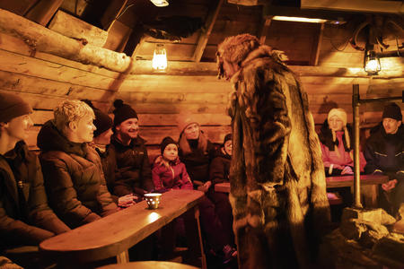 Es erwartet Sie eine mystische Atmosphäre in der Kota: Sie nehmen Platz auf warmen Rentierfellen und das Knistern des Feuers schafft die perfekte Stimmung, während der Schamane Sie mit Geschichten über die Magie Lapplands, lokale Folklore, die Polarlichter und die einzigartige Natur verzaubert. Er segnet Sie mit Glück und weiht Sie in den geheimnisvollen Kreis Lapplands ein.