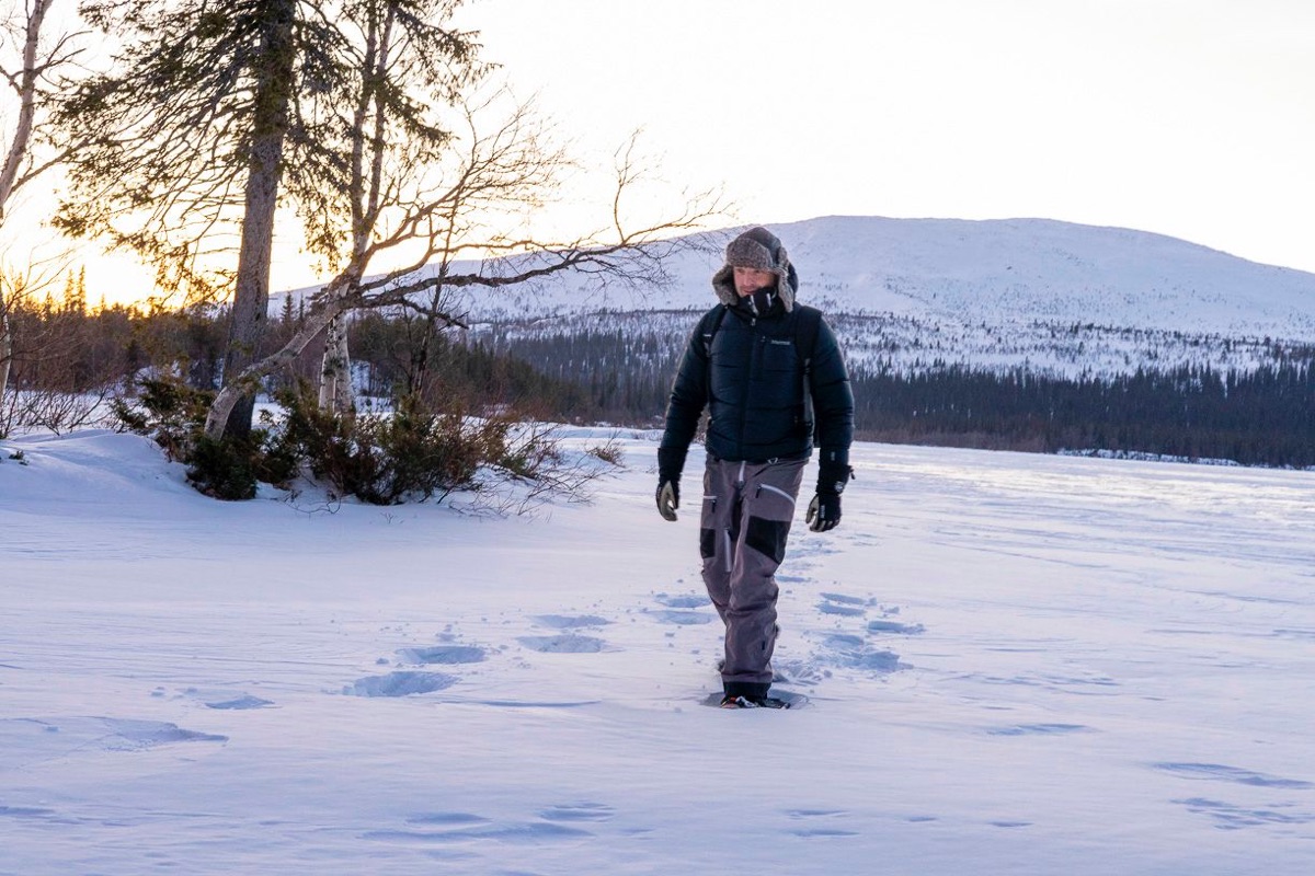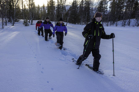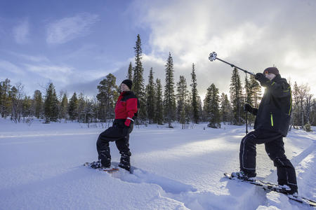Schneeschuhwandern bringt Sie der magischen Natur Lapplands tagsüber ganz nah. Mit den Schneeschuhen gleiten Sie mühelos selbst über tiefen Pulverschnee, der bis zur Hüfte reicht. Gemeinsam mit unserem erfahrenen Guide begeben Sie sich auf eine Wanderung durch verschneite Wälder und atemberaubende Winterlandschaften. Unterwegs erfahren Sie spannende Geschichten und Wissenswertes über die Tierwelt und Natur Lapplands. Diese Tour ist ideal für Naturliebhaber und alle, die die stille Schönheit der arktischen Landschaft auf umweltfreundliche Weise genießen möchten.