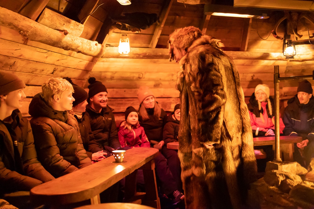 Danach übernimmt der Kota-Gastgeber, serviert heiße Getränke und kleine Snacks und erzählt spannende Geschichten über das Leben in Lappland – damals wie heute.