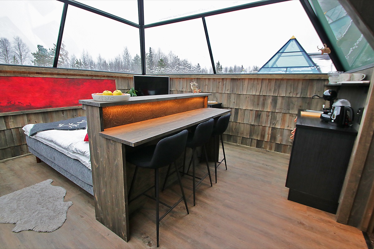 Bei dieser innovativen Erfindung der Finnen handelt es sich um transportable Hütten mit einer Rundumverglasung, welche sich unproblematisch an jedem Ort aufstellen lassen, im Sommer sogar als Hausboot auf einem See. Im Winter gibt es die kleinen Hütten aktuell in Kuusamo, Nangu, Torassieppi, Jeris, Ranua und Kittilä.