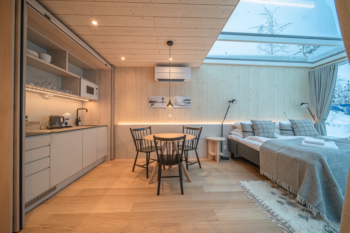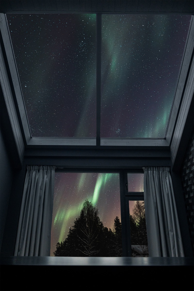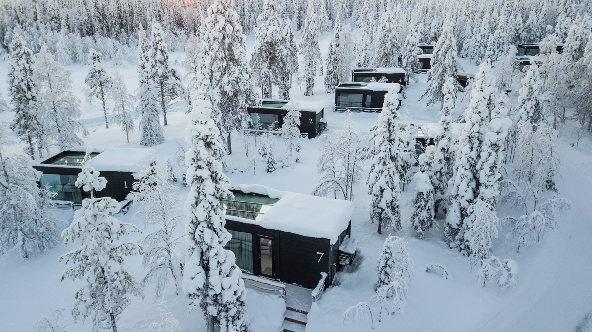 Das Hotel mit klassischen Doppelzimmern liege eingebettet in die schneereiche Natur des Syöte Nationalparks und steht für nachhaltigen Komfort und Abenteuer. Nur wenige hundert Meter entfernt laden vier Glasvillen mit Panoramafenstern und Glasdach zum Übernachten ein. Sie bieten Doppelbett, Miniküche, Fußbodenheizung und gratis WLAN. Die kostenfreie Sauna im Hotel rundet den erholsamen Aufenthalt ab.